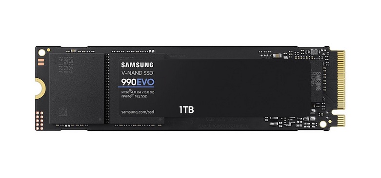 Samsung 990 EVO MZ-V9E1T0 offers 1TB storage with V-NAND TLC and Host Memory Buffer (HMB) for efficient data management. Featuring PCI Express NVMe 5.0 x2 interface delivers read/write speeds up to 7450/6900 MB/s. Compact M.2 2280 form factor enables easy installation and efficient space use.
